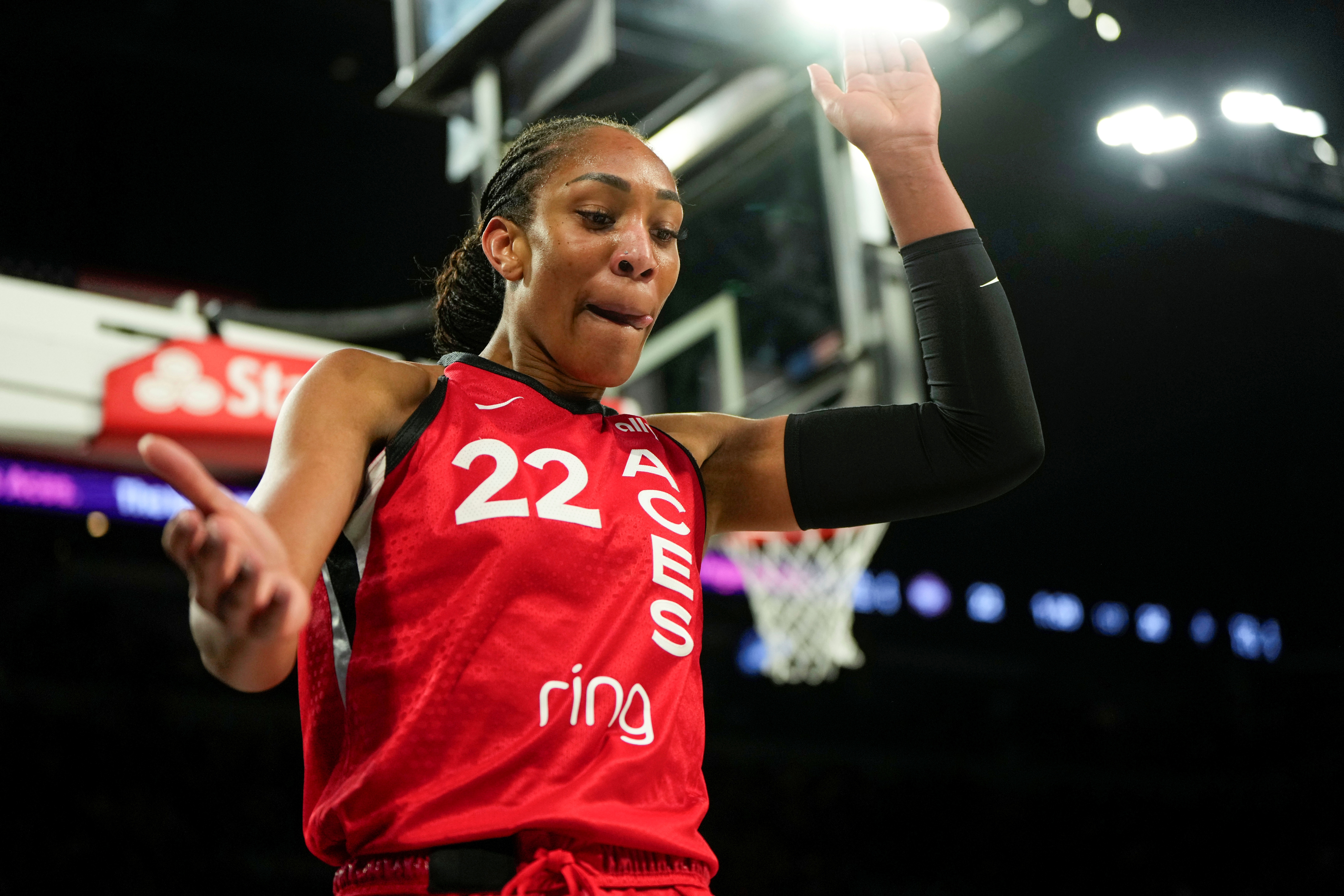 此役,王牌球星阿贾-威尔逊出战33分19秒,17投9中(三分3中3)、罚球2中2,轰下23分19篮板4助攻2抢断4盖帽的夸张数据,正负值高达+33!