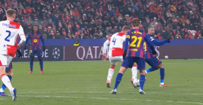 第34分钟,德容直塞,费尔明小角度抽射破门,巴萨1-1布拉格斯拉维亚