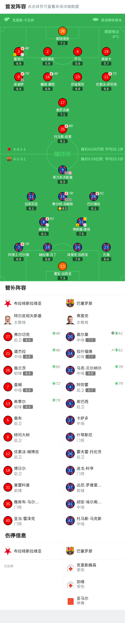 北京时间1月22日欧洲冠军联赛联赛阶段第7轮,布拉格斯拉维亚对阵巴塞罗那。上半场库谢伊幸运破门,费尔明梅开二度,莱万解围自摆乌龙,下半场奥尔莫世界波远射破门,莱万禁区钩射锁定胜局。最终比分布拉格斯拉维亚 2-4 巴萨。