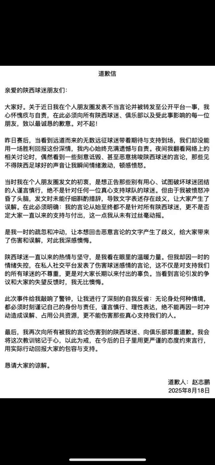 关于对本俱乐部翻译赵志鹏不当言论的处罚公告 日期:2025-08-21 11:27:47 作者:xiaoqiao 栏目:法甲 浏览:1804 评论:0 其个人道歉信内容如下 延伸阅读: leyuapp-久违的“雄起”回来了!成都疯狂主场绝杀领头羊 迈尔斯明日召开季末发布会 或将正式与勇士告别 乐鱼app-江苏唯一!南通家纺城足球俱乐部即将出征2026中国足协杯资格赛 体育爱好者-【观察】详解最后一节半,男篮如何从1分输到20分? 又进180俱乐部!35岁库里仍巅峰 勇士冲冠有底气 【世非预】刚果共和国vs坦桑尼亚比赛结果:刚果共和国(1-1)坦桑尼亚比分战报(2025年09月06日) 标签: 上一篇:巨星的排面!为欢迎库里中国行 重庆地铁换上充满库里元素的新装 下一篇:体育平台-解约金4.9亿!记者:小蜘蛛一直在与马竞谈续约 想留队为冠军而战